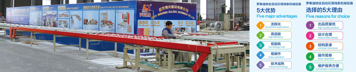 臨沂周興建材(玉興機(jī)械)有限公司始建于2001年7月,專業(yè)研發(fā)、生產(chǎn)全自動(dòng)鋁蜂窩板生產(chǎn)線,全自動(dòng)石膏線條生產(chǎn)設(shè)備,石膏吸音板,石膏板沖孔機(jī),PVC貼面石膏天花板機(jī)械(pvc貼面石膏板設(shè)備),主要包含:自動(dòng)上板機(jī),雙面覆膜機(jī),自動(dòng)分切鋸,自動(dòng)包邊機(jī),多用途自動(dòng)打包機(jī),全自動(dòng)碼垛機(jī)等。